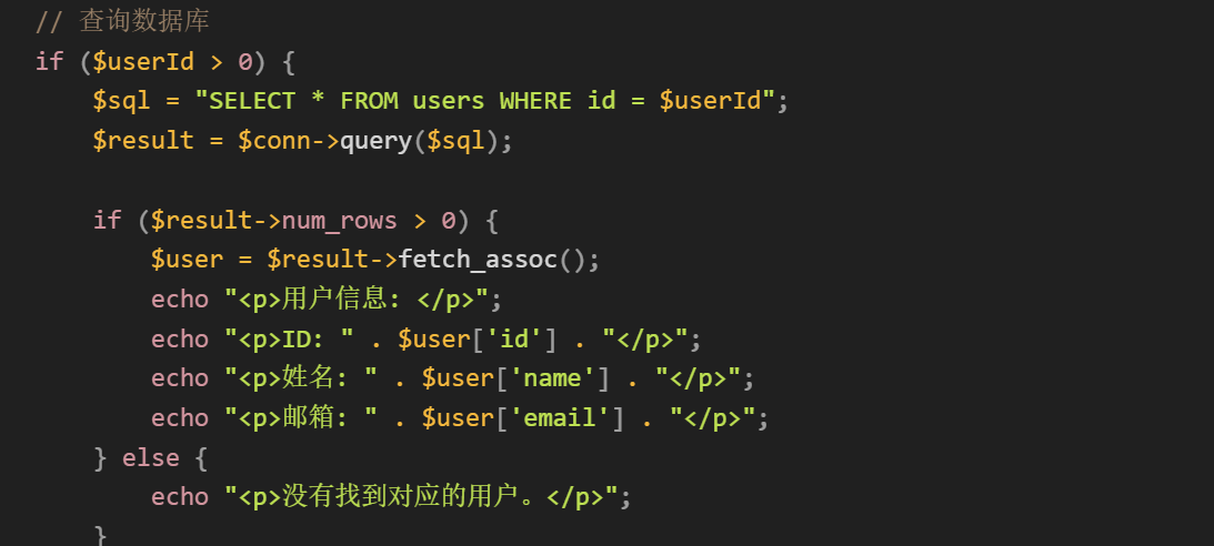 典型安全问题:直接拼接字符串进行 SQL 查找 如果此时用户恶意注入了一段 SQL 代码,比如将后面注释掉(--),前面插入恶意代码(SELECT ...),就会导致数据库中的信息暴露