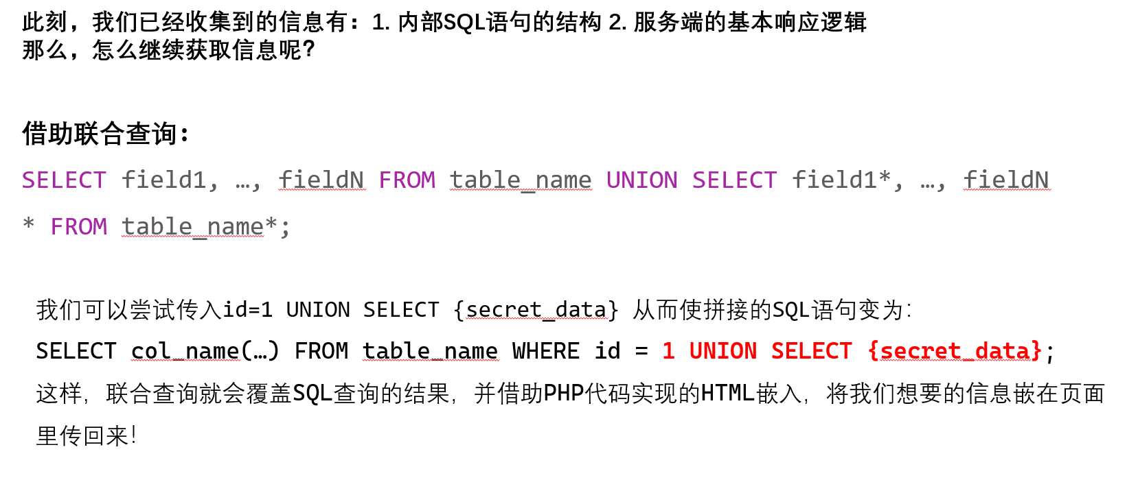 后者用 `UNION SELECT 1, 2, 3`来让各列嵌入 1, 2, 3...