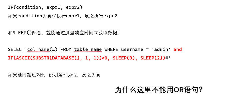 OR 的话从左到右寻找真值,所以用 OR 的话每次找用户 admin 找不到以后都会延时一次,导致延时时间过长,注入效率降低