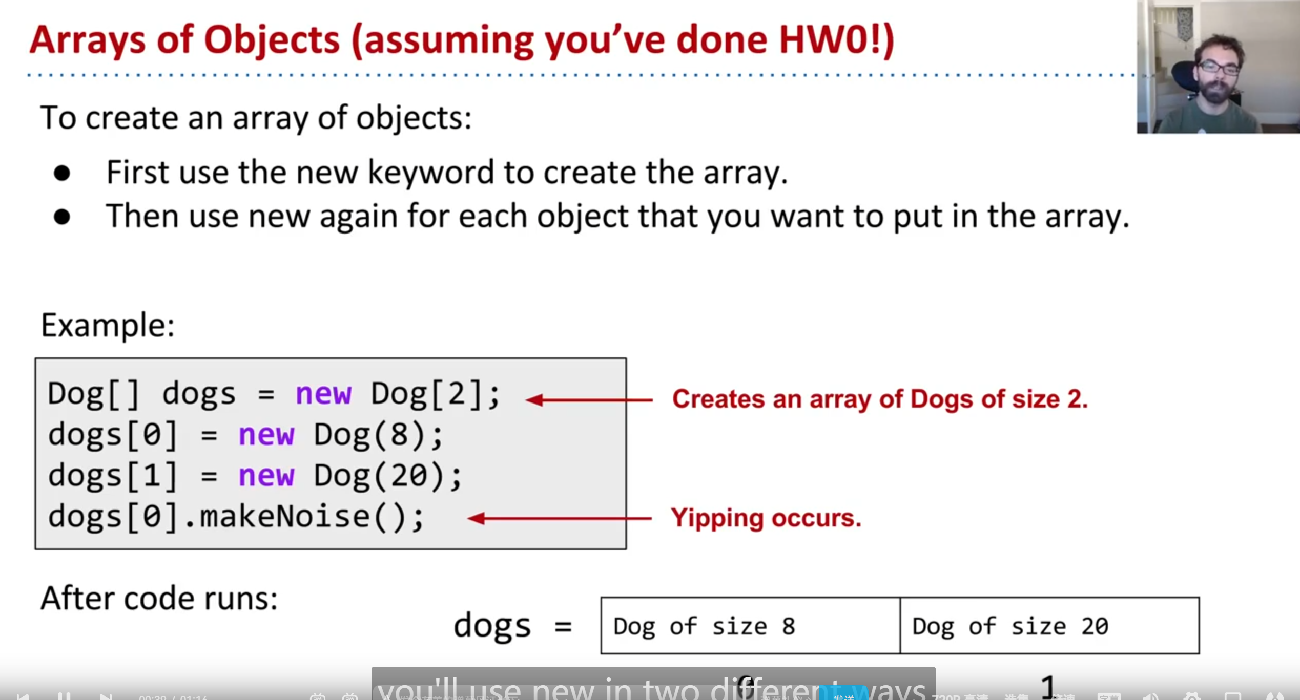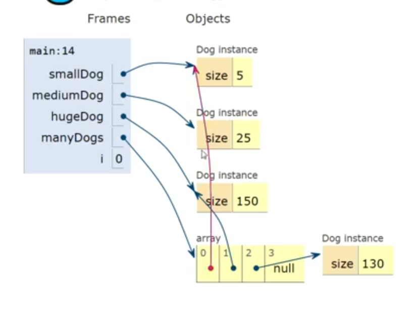 1  | Dog[] dogs = new Dog[2] //create 2 dog houses  |