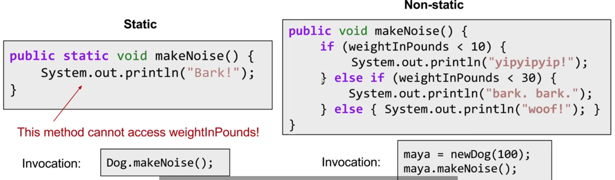 instance method : the method is going to be invoked by a instance variable in this class, then it should be instance(non-static)
